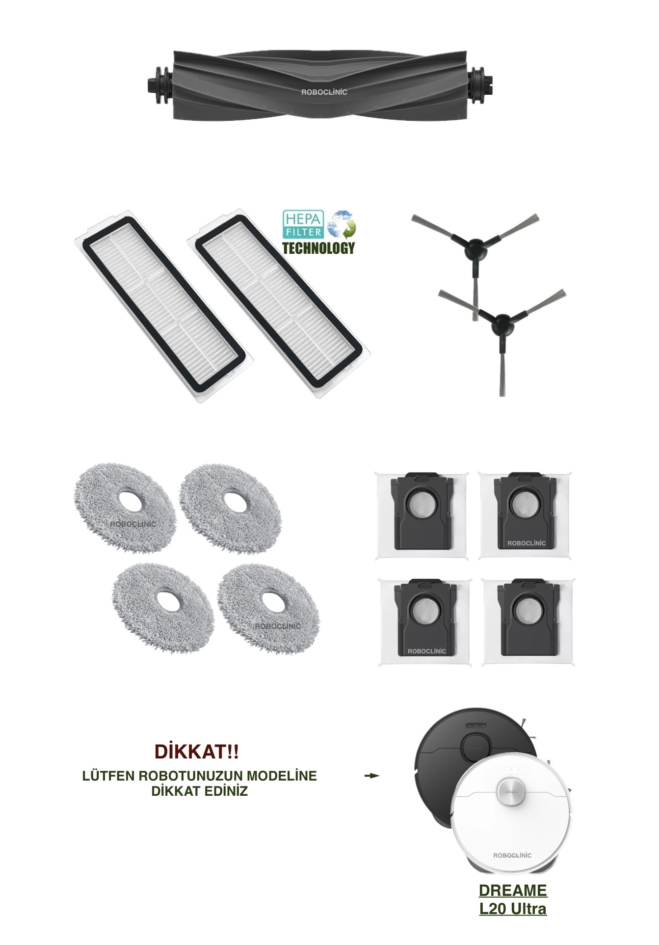 Dreame L20 Ultra Yedek Ana Fırça, Yan Fırça, HEPA Filtre, Mop, Toz Torbası – 13 Parça