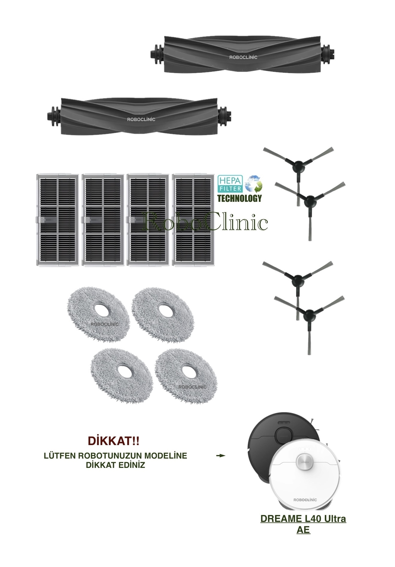 Dreame L40 Ultra AE Yedek Ana Fırça, Yan Fırça, HEPA Filtre, Mop – 14 Parça