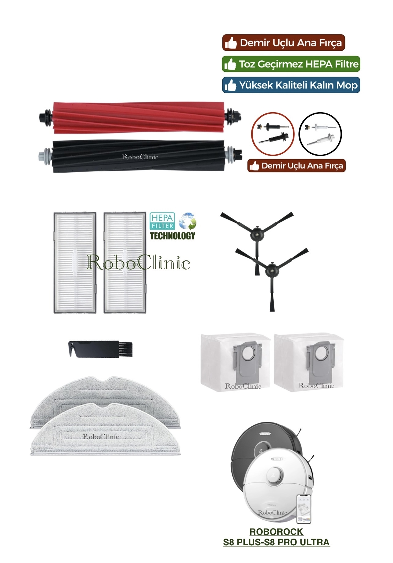 Roborock S8 Pro Ultra Yedek Ana Fırça, Yan Fırça, HEPA Filtre, Mop, Toz Torbası – 11 Parça